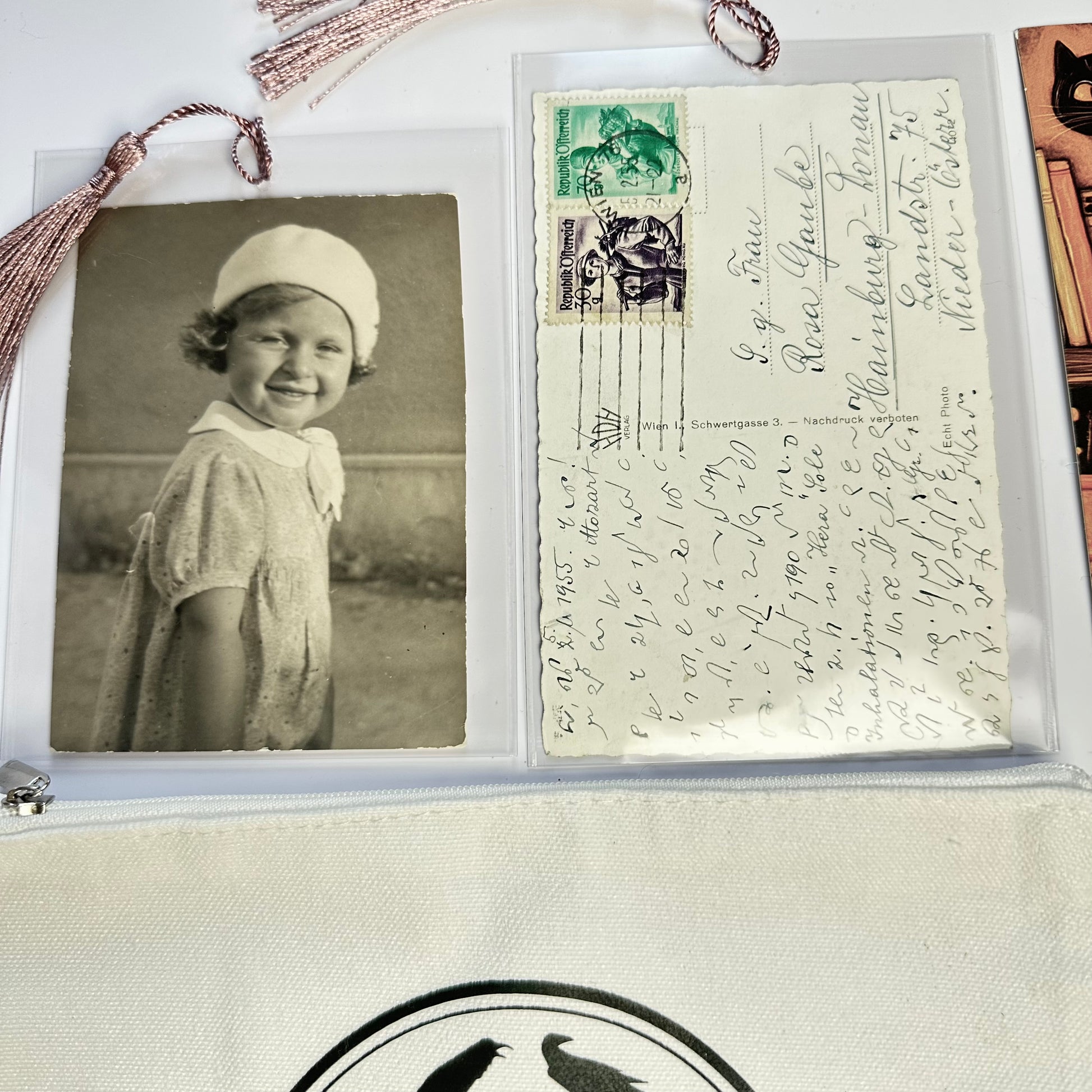 - 2 original vintage postcards and/or photos (some with stamps!) in protective covers – perfect as bookmarks